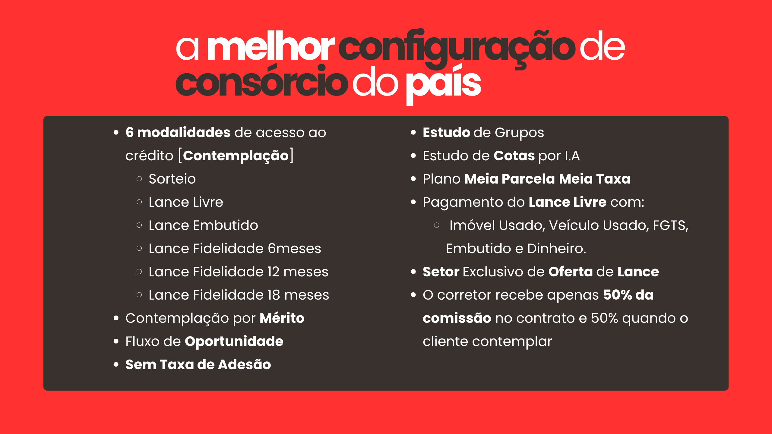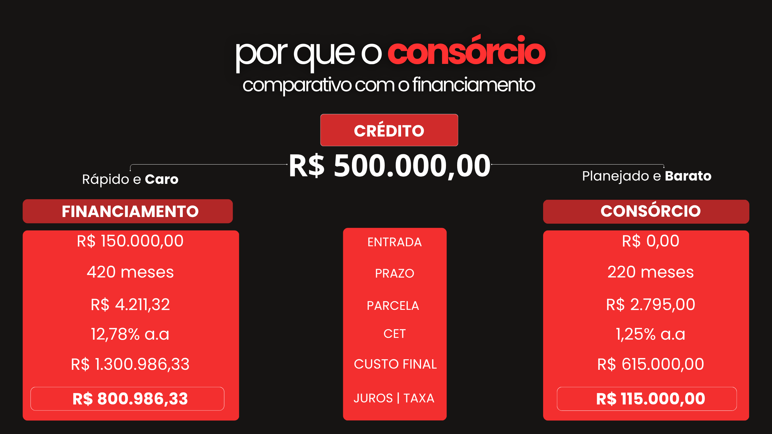 Para quem tem pressa, é recomendável ofertar um lance. Oferecemos quatro modalidades de lance: Fixo, Fidelidade de 6 meses, Fidelidade de 12 meses e Livre.Imagine o grupo como se fosse um condomínio, onde seus participantes contribuem mensalmente com suas parcelas. O dinheiro arrecadado é então distribuído integralmente aos contemplados por meio de sorteio e lances dentro do mês. A administradora atua como o síndico do condomínio, organizando todo o sistema.O que comparado aos financiamentos tradicionais representam economia de até 70%.